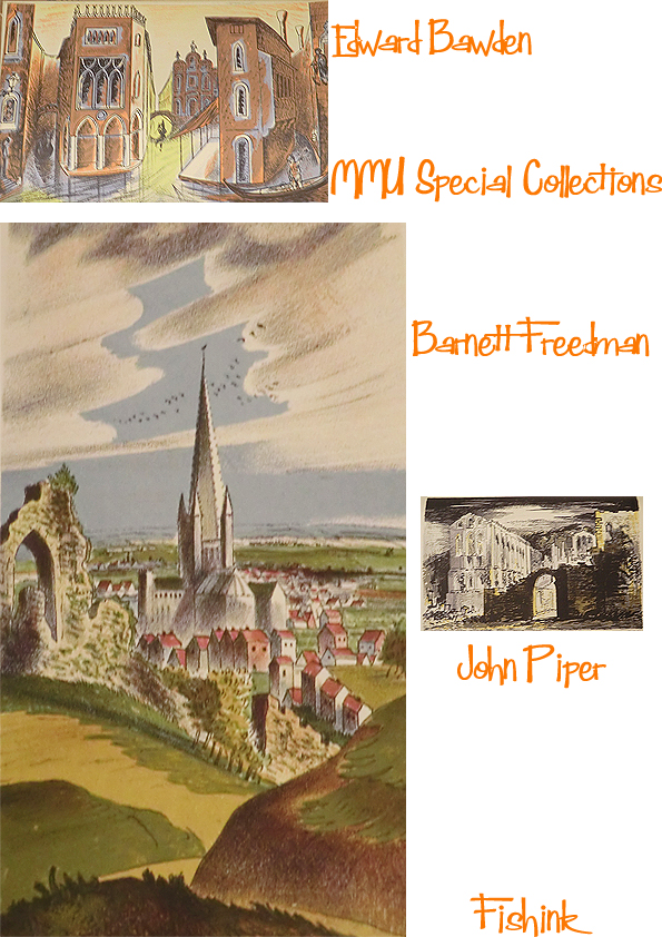 It was the generation of artists who had been establishing their reputation before the War that inspired Rena. Eric Ravilious, Edward Bawden, John Piper, and Barnett Freedman, all of whom made lithographs. Rena visited exhibitions organised by the Recording Britain Scheme initiated by Sir Kenneth Clark as an extension of the Official War Artists Scheme. This featured such artists as Kenneth Rountree, Thomas Hennell, Rowland Hilder, Enid Marx and Barbara Jones. Rena was an avid reader of John Betjeman’s and John Piper’s Shell Guides as well. However she also admired the work of topographical artists of the past such as Thomas Girtin, John Sell Cotman and Thomas Shotter Boys, and the technique of the great lithographers such as Honore Daumier.