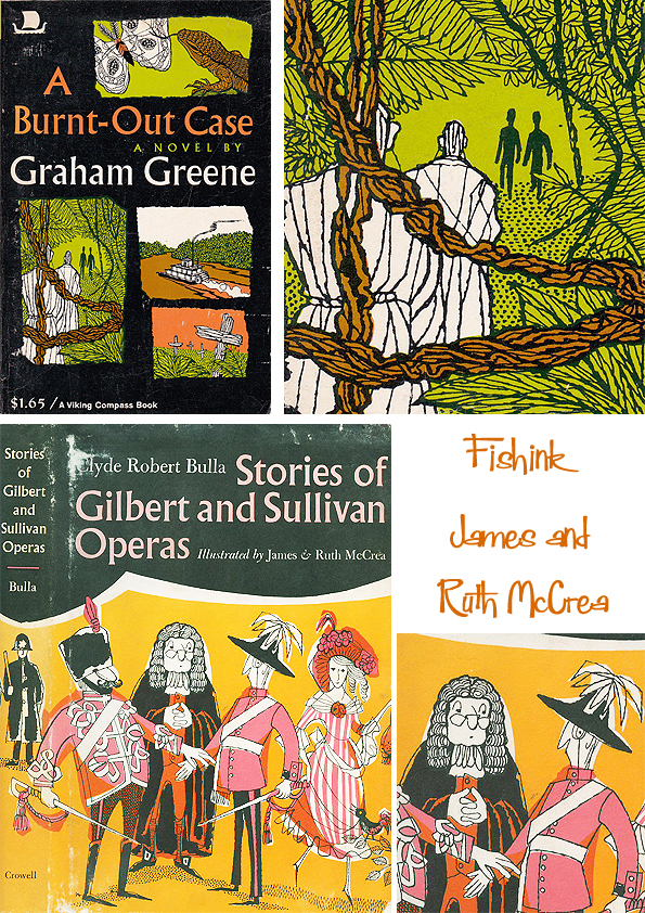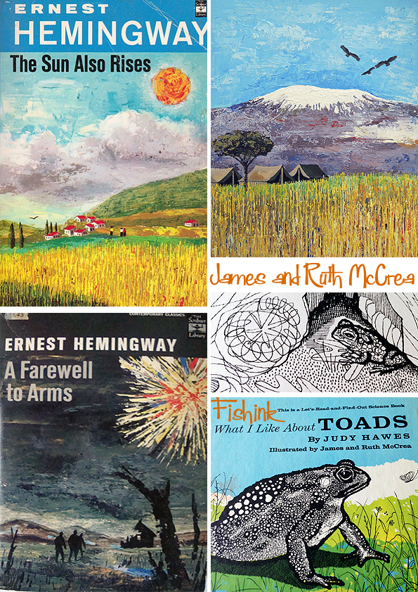 The McCreas also collaborated on dozens of book jackets, designs, and illustrations including covers for novels by such writers as Graham Greene and Iris Murdoch. They worked together on the original oil paintings used for the cover design of the full set of Ernest Hemingway titles in the Scribner Classic series. Some featured below.