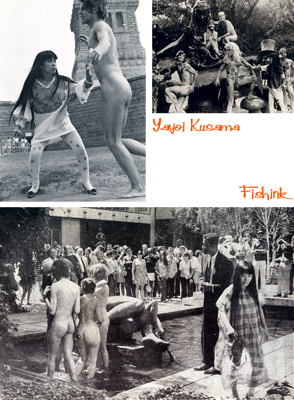 During 1968 and 1969, Yayoi staged events across Manhattan, from the United Nations Building and the New York Stock Exchange to the Statue of Liberty, Brooklyn Bridge and Central Park’s Alice in Wonderland statue. Frequently, these happenings involved her working with groups of naked men and women covered with her signature polka dots and dancing on the streets, until inevitably they were forced to move along by the police. In one instance, at the Museum of Modern Art, eight nude participants struck poses in the fountain of the museum’s sculpture garden. By this stage, the art press was familiar with the rhetoric of Kusama’s anti-capitalist, anti-war, anti-establishment and free love happenings, however, this particular spectacle attracted front page coverage by the Daily News, who reported that museum security officers spent 20 minutes attempting to coax the performers out of the water. Yayoi famously referred to the art gallery as the ‘Mausoleum of Modern Art’ and said ‘What is modern there ? . . . Van Gogh, Cézanne, those other ghosts, all are dead or dying. While the dead show dead artists, living artists die’
