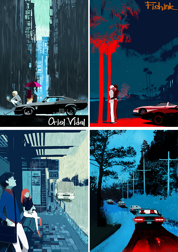 Oriol Vidal is an illustrator/storyboard artist based in Barcelona. Like most successful artists these days, he has a few different styles to his work. One of his advertising styles works with a combination of photography, figures and dramatic lighting. A couple of these reminded me of Starsky and Hutch … perhaps it’s the car !