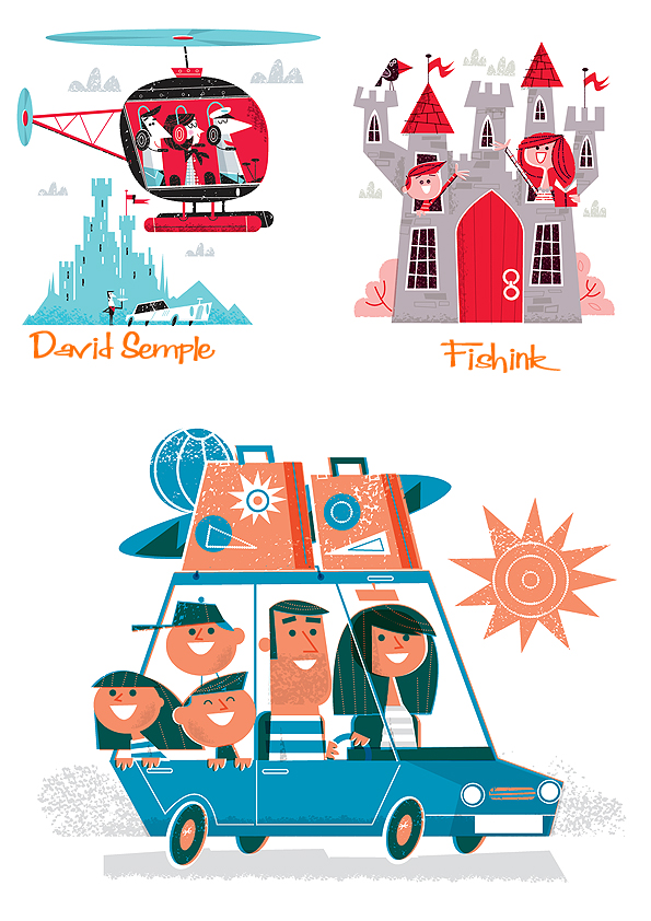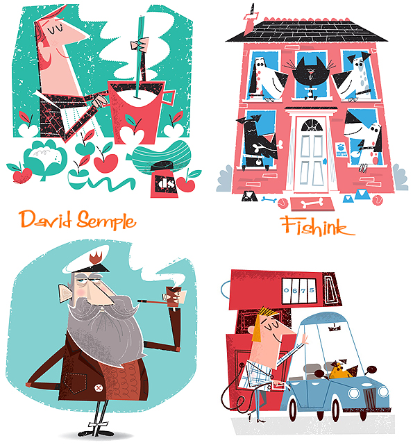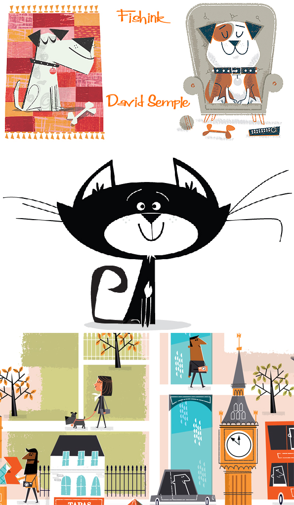 These are fab! Kind of reminds me of the groovy illustrations for the first Disney cartoon of ‘The 101 Dalmatians’ from 1961, many done by the abstract painter Walt Peregoy. All those bold slabs of colour as a background. The way Semple keeps the colour palette simple – brill!