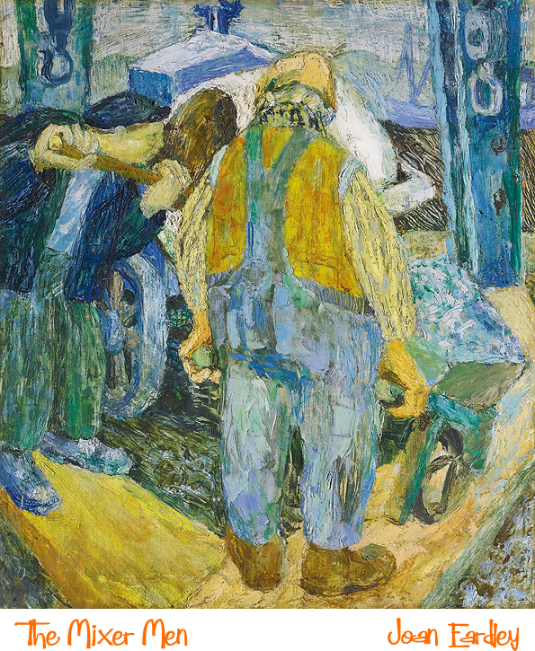 In 1943 she was awarded a diploma in Drawing and Painting, and won the Sir James Guthrie Prize for Portraiture. After graduating in 1943 Joan trained as a teacher at Jordanhill Teacher Training College, but she never liked classroom teaching and left after one term. She chose instead to work as a joiners apprentice with a small boat building firm in Bearsden. This work, which, throughout 1944 included painting camouflage patterns on landing craft for the war effort, allowed her to attend evening classes at the Glasgow School of Art until 1946. During the war, her painting of her shipyard work mates, The Mixer Men was shown at Royal Glasgow Institute of the Fine Arts.