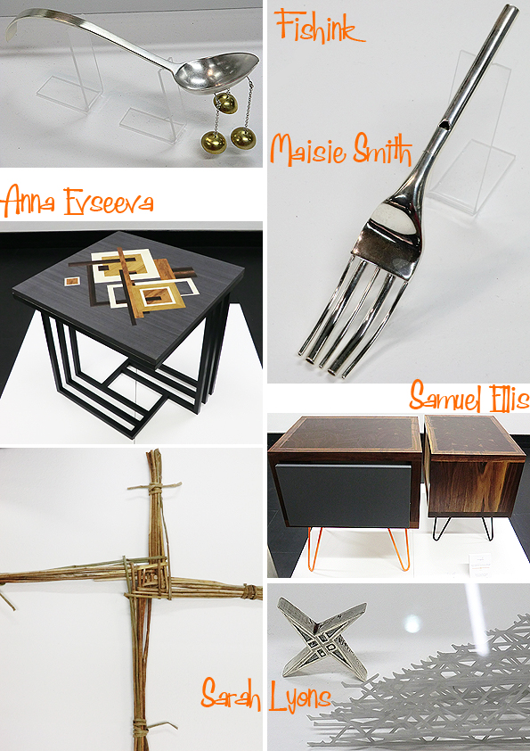 Silver pieces from Maisie Smith, a beautifully designed table with inlaid wood by Anna Evseeva and some contemporary retro cabinets from Samuel Ellis.