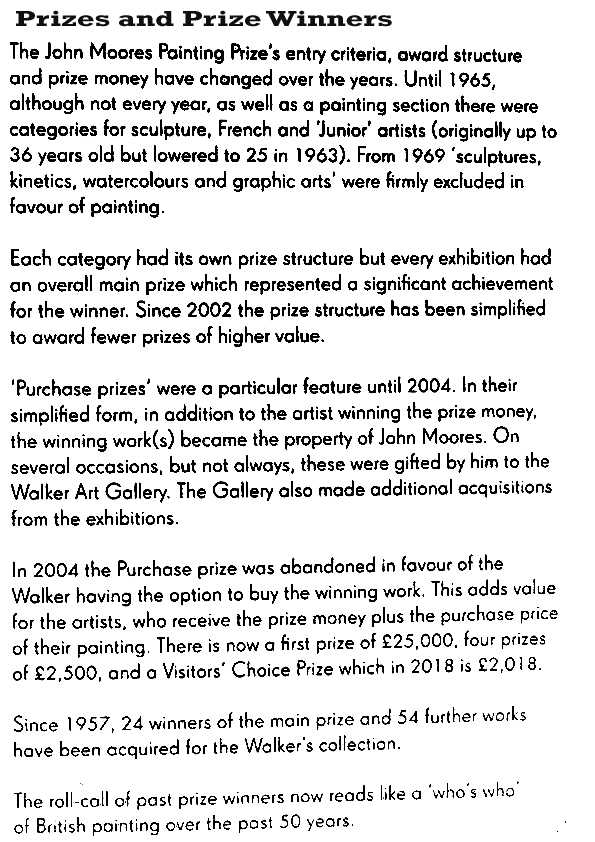 The John Moores Painting Prize entry criteria, award structure and prize money has changed over the years. Until 1965, although not every year, as well as a painting section there were categories for sculpture, French and junior artists. From 1969, sculptures, kinetics, watercolours and graphic arts were firmly excluded in favour of painting.
