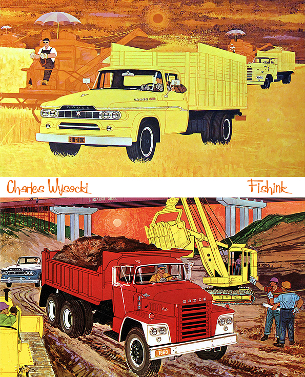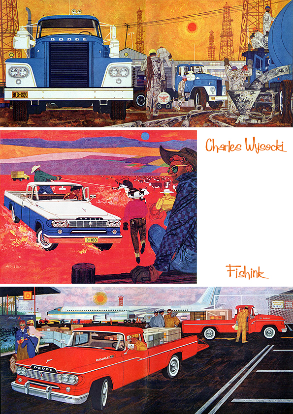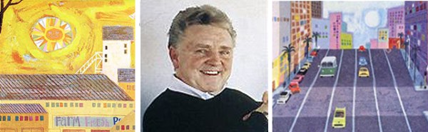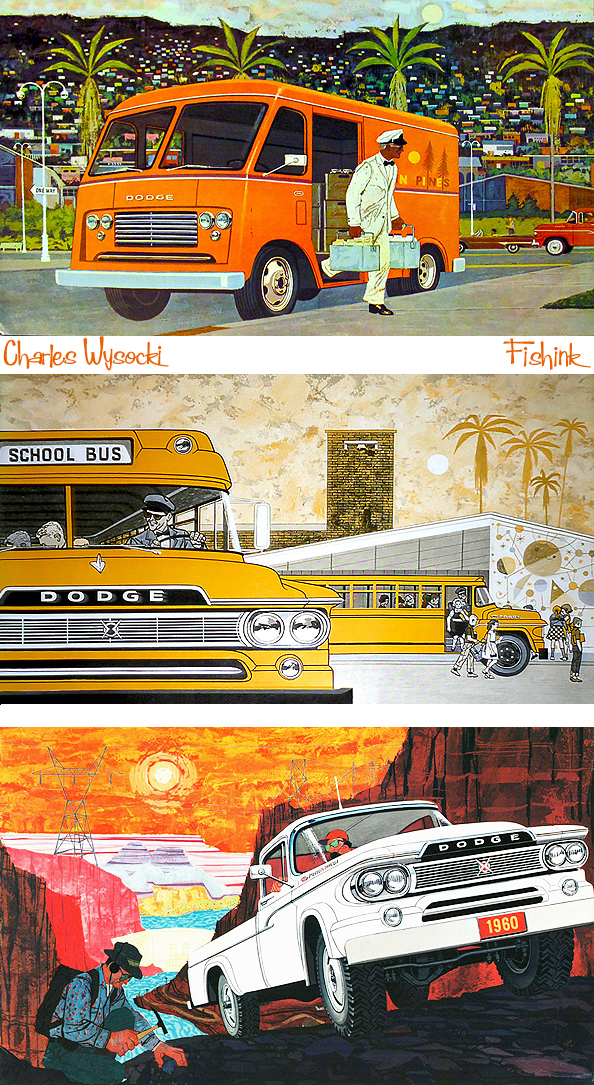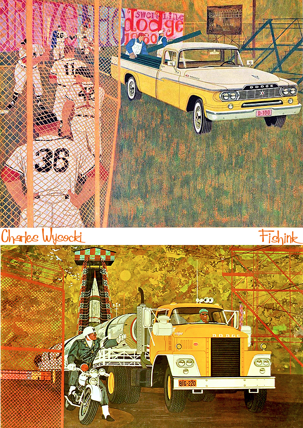 I agree about the early 60’s vibrant, abstract skies – they are much more appealing to me than his Americana style, which reminds me too much of christmas cards and twee dinner mats on my Grandma’s table! What’s odd about his early 60’s stuff, is that while the backgrounds are groovy in a scruffy, abstract kind of way, the actual cars are rendered very precisely, so the contrast between the foreground and the background is strangely jarring. Perhaps he was trying to prove something to his motor mechanic father?” Look Dad – I don’t want to work at Ford like you do, but see how brilliantly I can paint cars!!”