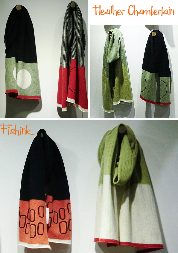 The second knitwear company was Heather Chamberlain. Luscious greens and linear shapes defined Heather’s collection. Autumnal scarves, wonderfully soft to the touch with a naturally rolled edge. I wanted a jumper made out of them.