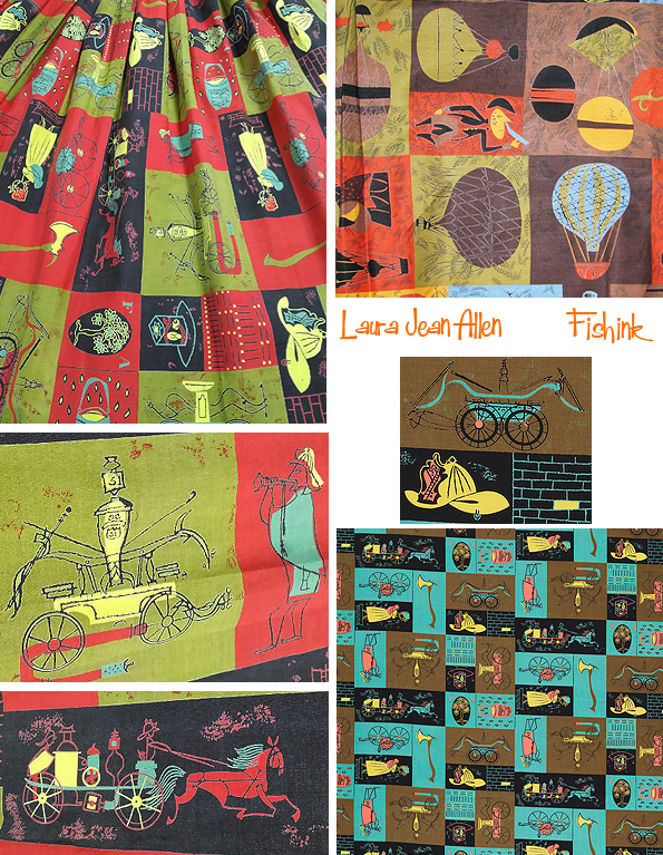 My grandmother, a seamstress and quilter, left a large stash of fabric when she died. Digging through the stash, I recently unearthed 3 yards of a Laura Jean Allen fabric called “Pretty Foxy,” from 1952. It is *wonderful.* I came upon this post while looking for some information about Allen. Thanks for this info–fabulous.