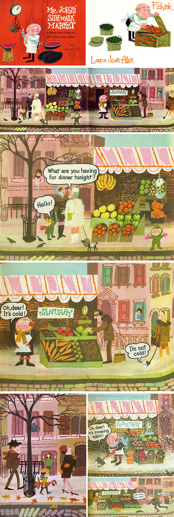 She also created Mr. Jolly’s Sidewalk Market (Holt, Rinehart and Winston, 1965). I think her style here is very similar to another favourite of mine Michel Sasek.