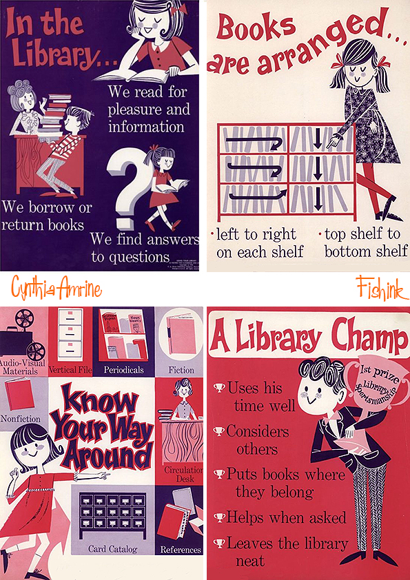 In 1965, Cynthia Amrine worked with librarian Mary Joan Egan to publish Using Your Library: 32 Posters for Classroom and Library, a lavishly illustrated book of tear-sheet posters for educators and librarians to promote library usage in primary and secondary schools.