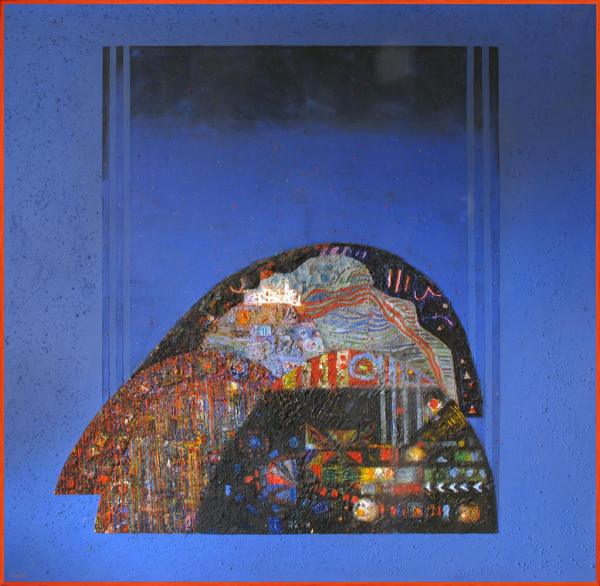 Oil painting. Mediterranean landscape and Castellaras, the village where our parents and we, as children lived. This painting hung in our home. It was a gift from Brian to our mother. 172X172cm. Oil and acrylic on sand/glue textured cement. c. 1985. One of approx 100 he painted and that have never been seen in Europe. This one never seen anywhere.