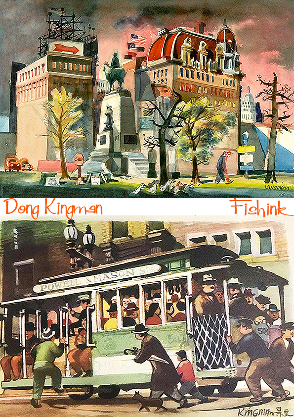 Dong Kingman (1911-2000) was born in Oakland, CA of Chinese parents was originally named Dong Moy Shu. According to Chinese custom, Kingman was given his new name when he entered school. Hearing that he wanted to be an artist, his teacher gave him the name of King (scenery) and Man (composition). In later years he combined the two words into Kingman and following Chinese custom, he used the family name first and the given name second. He studied at the Ling Nan School in Hong Kong.