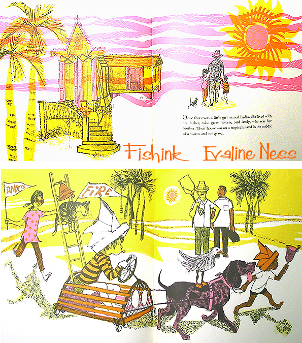 Her three Caldecott Honor Books were published 1963 to 1965: All in the Morning Early by Sorche Nic Leodhas, A Pocketful of Cricket by Rebecca Caudill, and Tom Tit Tot: An English Folk Tale retold by Virginia Haviland. She herself wrote the Caldecott-winning Sam, Bangs and Moonshine (1966), about a fisherman’s daughter, illustrated with line and wash drawings. “Sam” (Samantha) tells lies or “moonshine”, which finally endanger her pet cat “Bangs” and a neighbor boy; she learns responsibility for what she says. (see post 1 for illustrations).