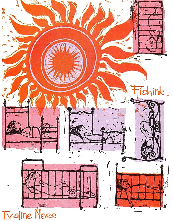 This talent is especially evident in her own written works with their girl protagonists and subtle stories that have a backdrop of ‘feminism’ and present ‘real’ characters learning about all of life’s pleasures, problems, and pains. Because printer’s ink is flat, Evalines’ constant concern was how to get texture into that flatness. The primary challenge in illustrating children’s books, she believed, was how to maintain freedom within limitation. Some of the techniques she has used to combat these limitations include woodcut, serigraphy, rubber-roller technique, ink splattering, and sometimes spitting.