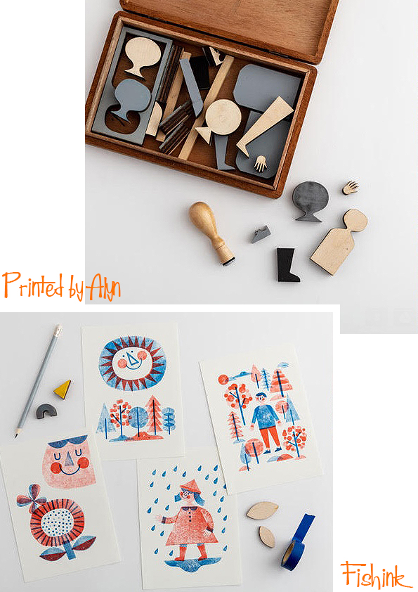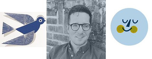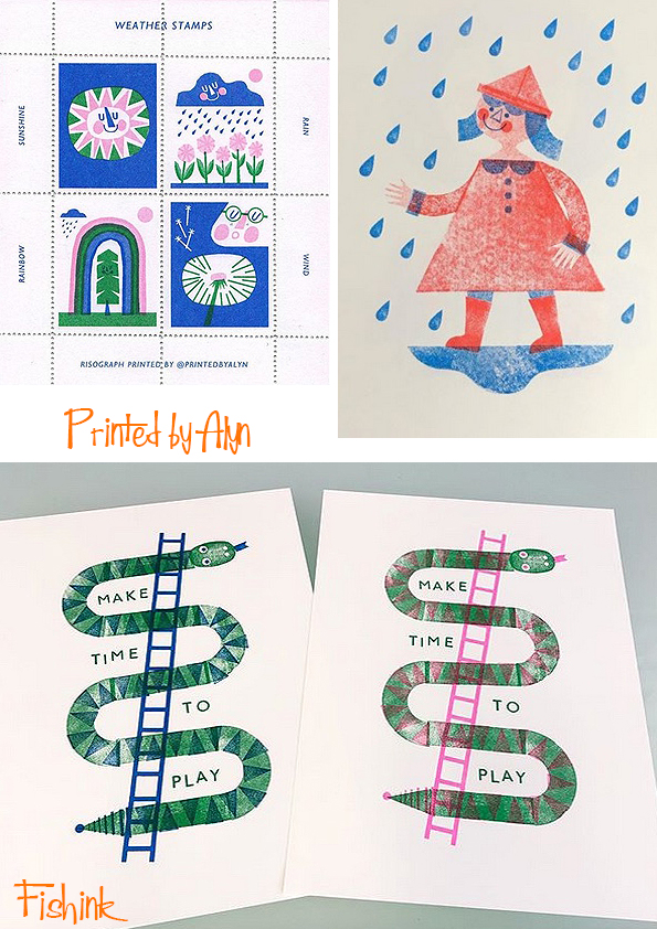 You can see how his process of creating, develops from his stamp-making and spongy cut-out shapes, to his assembled illustrations and sometimes digital end-use.