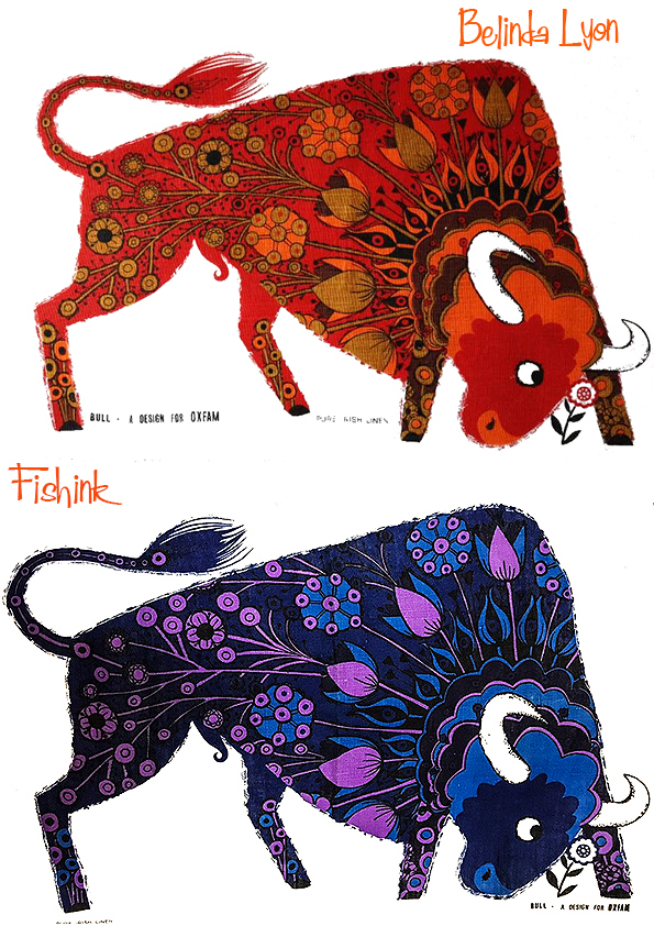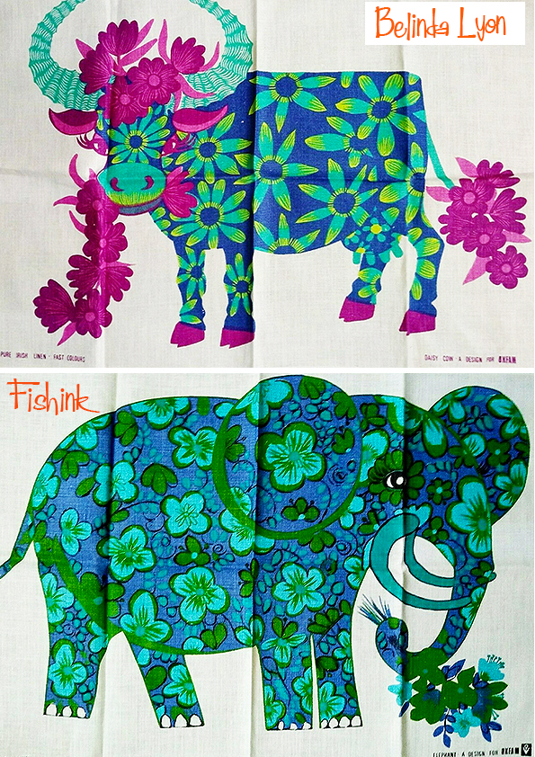 Belinda is more well known to 1970’s retro fans for her lovely tea towel and fabric cut out designs which became part of the massive Oxfam retail success story. Belinda’s first design for Oxfam was a colourful Christmas card illustration in 1966. In 1967 Oxfam introduced their first “own brand” products consisting of the first two tea towels. The elephant and giraffe were initially produced in three colours and were selected for the London Design Centre – at this time still known as the Council for Industrial Design, prior to the opening of the Design Centre shop in 1971 which had people flocking in to buy the latest trend setting products. The first 2 Oxfam tea towels were produced in 3 different base colours.