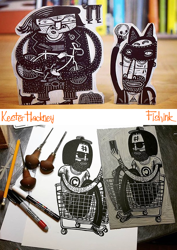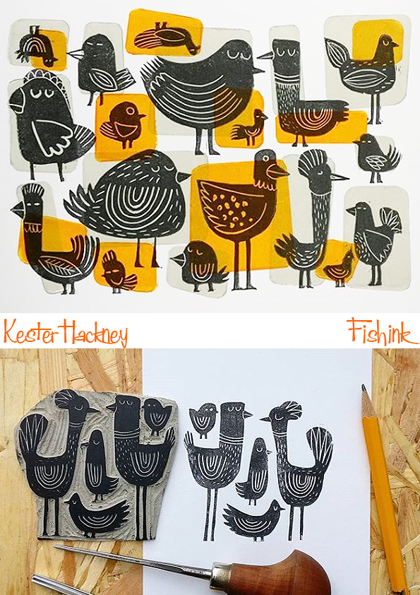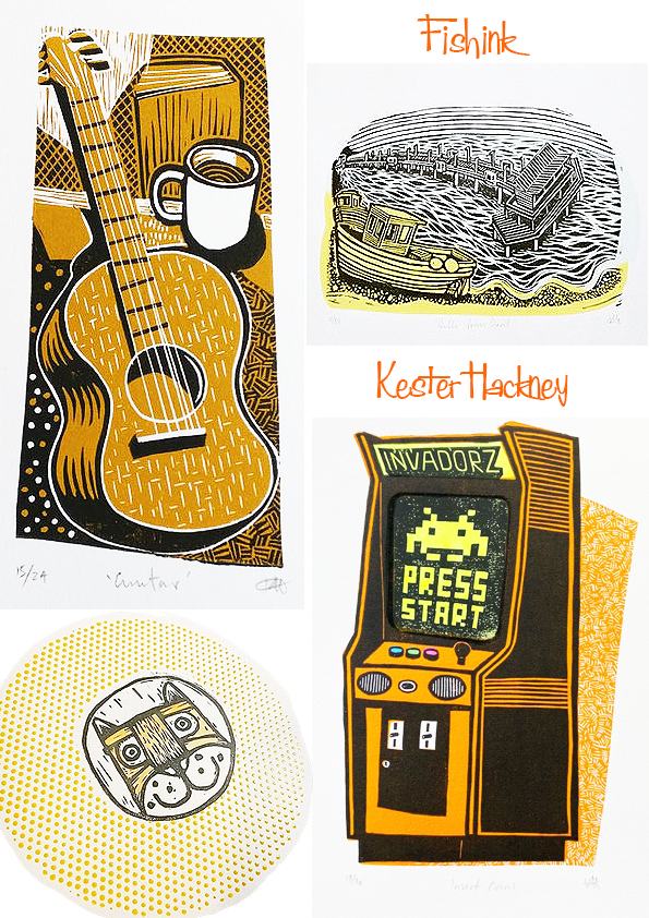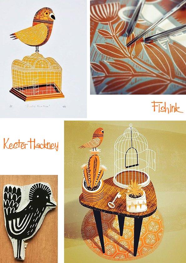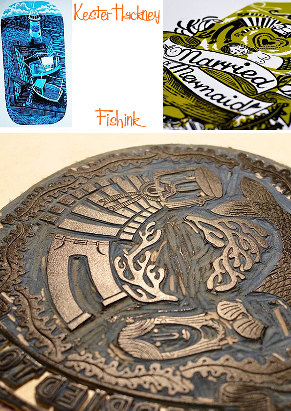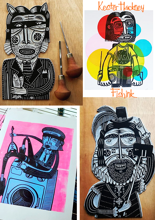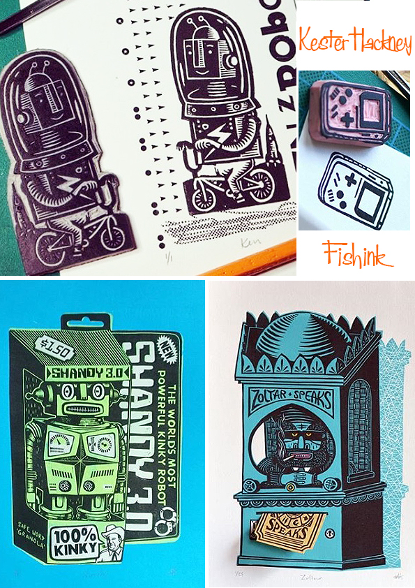 Tigerlino is the business from Web Designer and Graphic Artist Kester Hackney. Printing from a cabin in Deal on the Kent coast, he designs, lino cuts and prints a whole array of boyish delights from robots to mermaids, rock heros to crazy birds.  Kester creates some wonderfully midcentury-esque work that give a modern day nod to the likes of Cliff Roberts and Jim Flora.