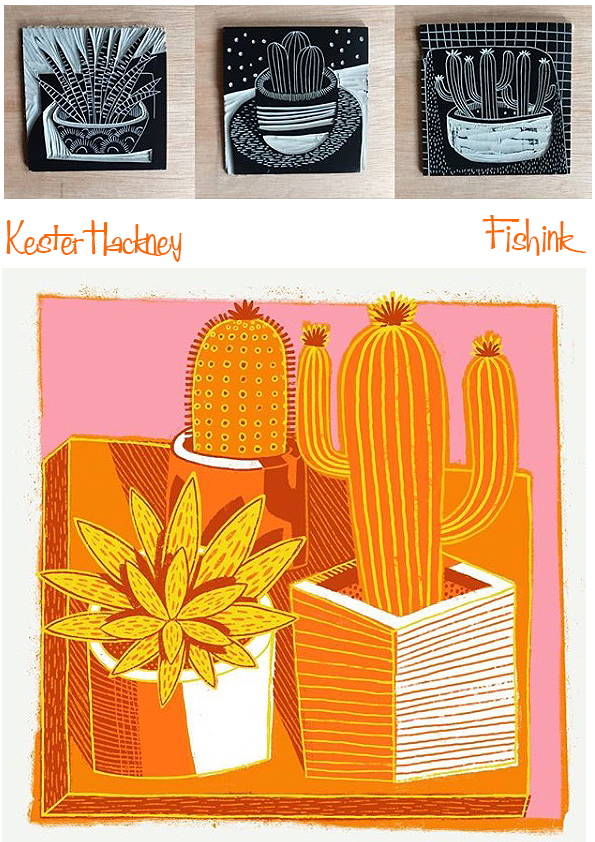 Most of the time I have a couple of ideas knocking around in my brain that need to come out. I always find that it’s like scratching an itch until you manage to find the time to turn them in to something tangible. I don’t have a hard and fast method for turning an idea into a print. Sometimes I’ll know exactly what I want to achieve, or I’ll just take it as a it comes and start putting elements together straight onto the lino and adapt and add until I’m happy. In a way, I quite like to work like that, so it’s a bit of a surprise to see where the design ends up. I’m always on the look out for strange shapes and patterns in trees and curtains. (It’s called Pareidolia, I just looked that up). I get a few ideas that way.