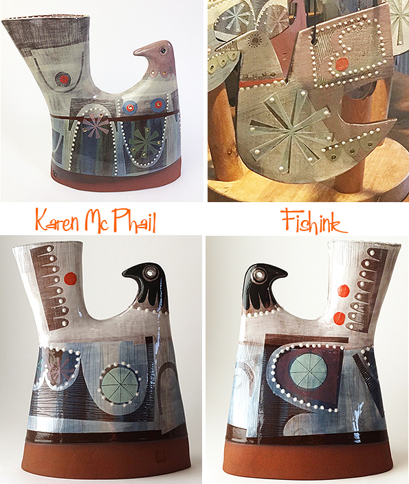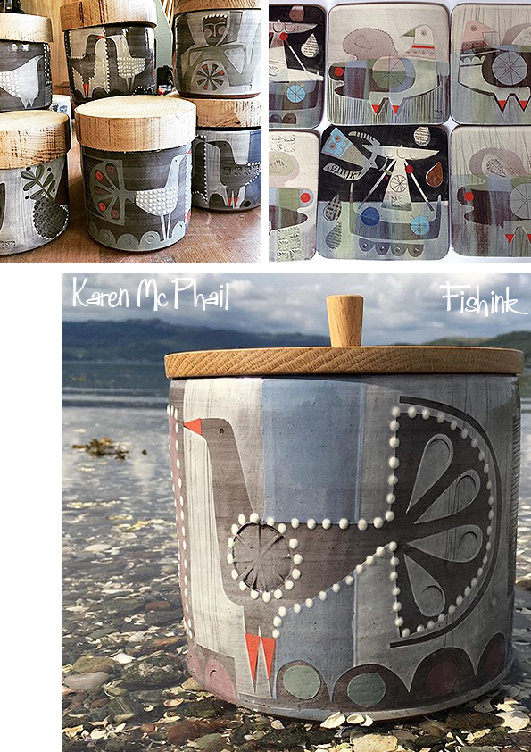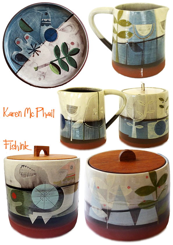 Karen states :- “My aim is to create visually satisfying objects for domestic environments that have a quality of surface and pattern, and that appeal to our sense of touch. My process involves layers of bold and playful decoration while retaining the inherent warmth of red earthenware clay. Simple forms are made on the wheel, handbuilt or using plaster moulds. I collect imagery from daily life and nature to make paper collages and, before the first firing, coloured slips are brushed on to the ‘leather hard’ pieces using cut paper stencils. Newspaper lettering on the final work echoes this process. Layers of applied slip produce a subtle raised decoration and can be drawn though to reveal the red clay beneath. A second glaze firing is followed by a third for the application of printed decals. ”