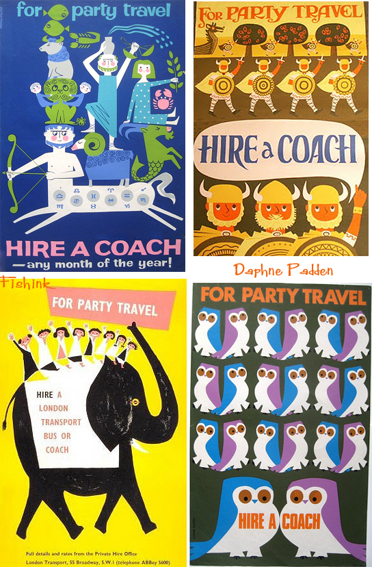 How wonderful and fascinating to see her disparate styles together. I just realized that a vintage tea towel I have is directly lifted from her Hire a Coach poster with the owls!