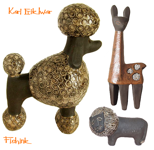Karl Erik Iwar (1920-2006) studied at Upsala Ekeby and then in the early 1950’s he opened his own workshop. He then worked for the company between 1936 and 1946. Karl Erik is today most known for his pottery animals from his workshop in Farsta and Åkersberga in 1953–1987. They are made of dark brown earthenware, with modernistic shape, and gently humorous expression. The figurines are partly glazed in earthy tones.