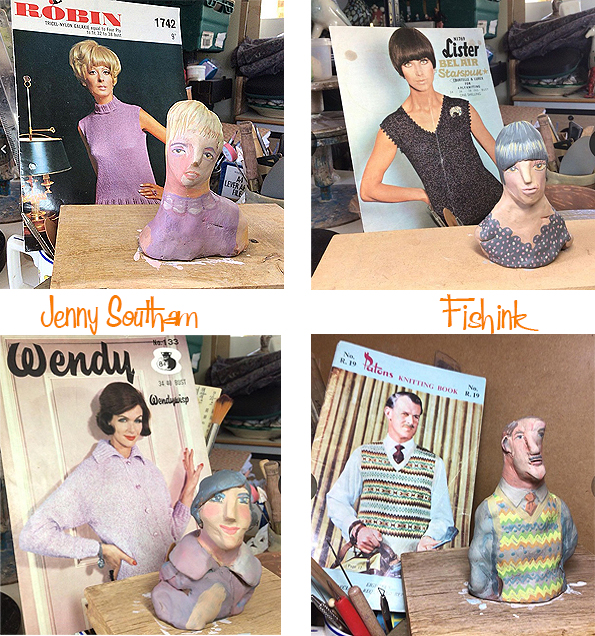 I’ve collected vintage knitting patterns for a few decades now, just for their quirky imagery. But it was only a couple of years ago that it came to me that I could use this imagery as a starting point for my own figurative ceramic work. They are a very individual and unusual historical phenomena in that they show models, obviously showing off the knitwear, but also set often within a scene or environment, either indoors or outdoors. This might be a garden or park, an art gallery, cafe or a living room.
