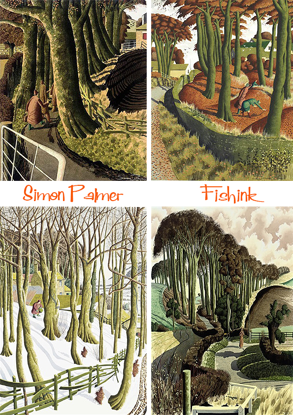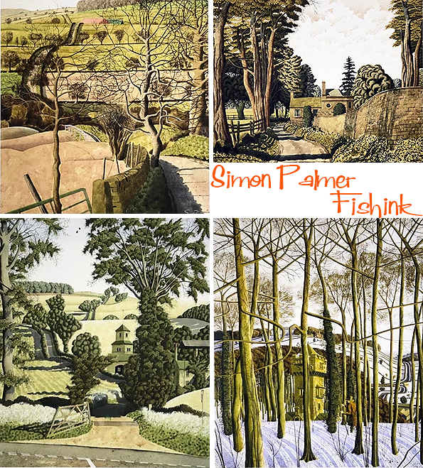 Simon Palmer was born in Yorkshire in 1956, and graduated from art school in 1977. He has exhibited extensively since 1980, and held ten one-man exhibitions in London with JHW Fine Art. For me his work has flavours of James McIntosh Patrick, Paul Nash, Eric Ravilious, Samuel Palmer, Stanley Spencer and even a tiny sprinkling of Beryl Cook !