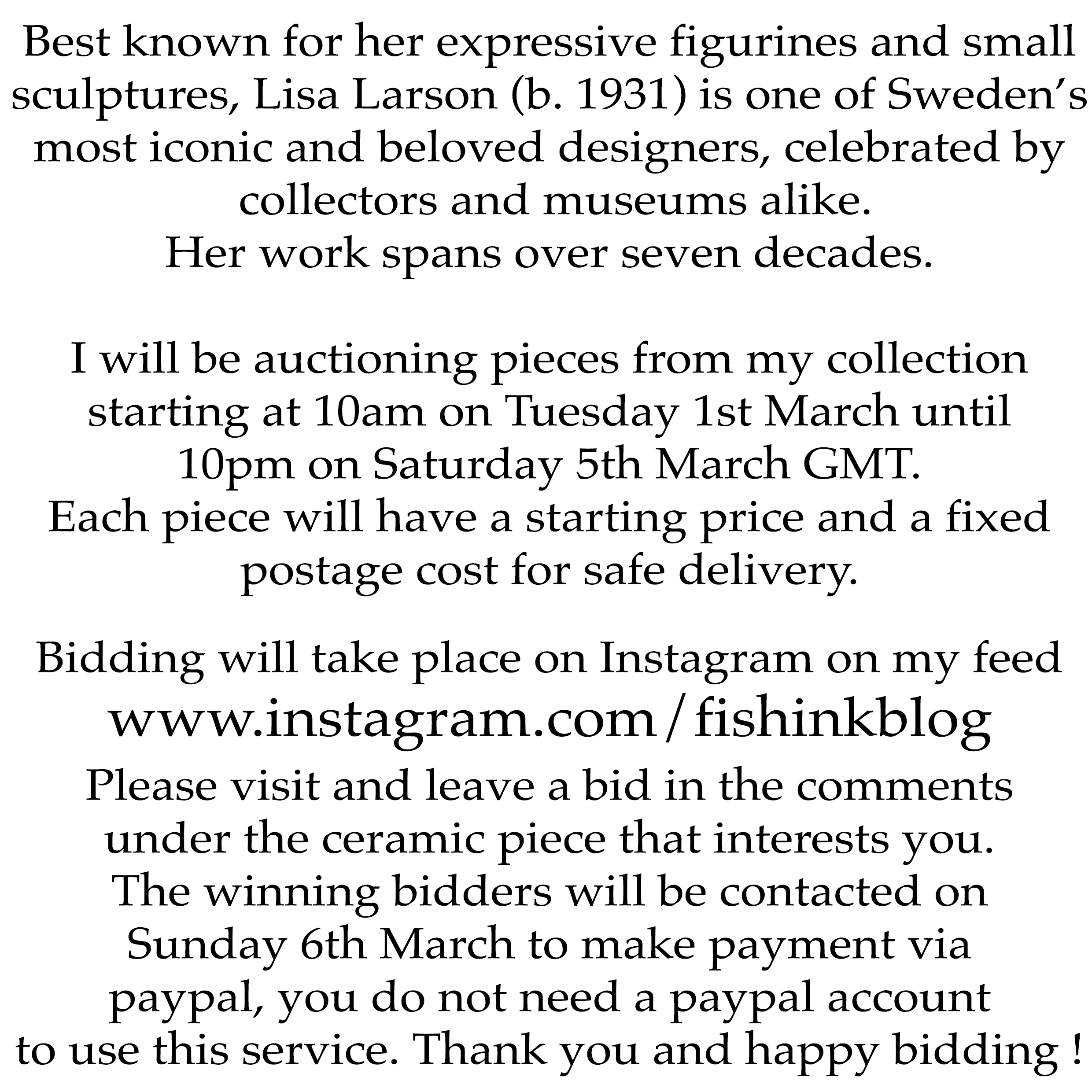 I am having an auction-style sale of some of my Lisa Larson figures. if like me you have always wanted to own one of her beautiful midcentury figures, well here is your chance.