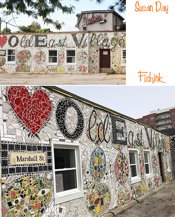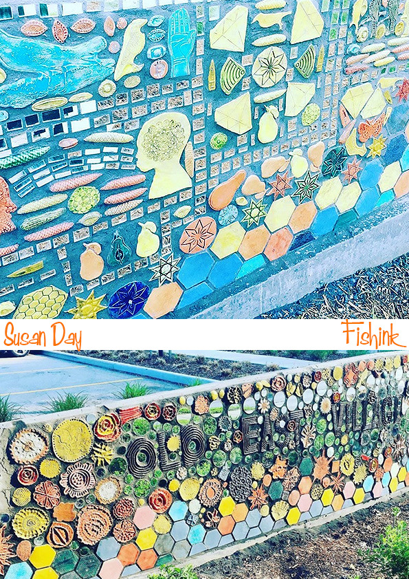 A total of 650 individuals from 25 distinct groups participated in workshops related to the mosaic project throughout the spring and summer of 2017. In addition, 80 member-artists of The London Potters Guild (LPG), the charitable organization that owns and operates LCAC, volunteered 880 hours working alongside community members, teaching and encouraging them to tell their stories by building, carving, stamping, and painting images on the clay. Around the area of the Old East Village, Susan has taken on a number of other large scale projects such as the Wayfinding Mosaics..
