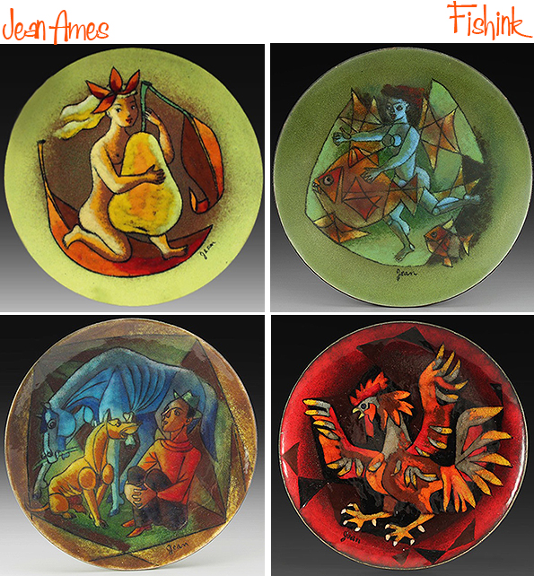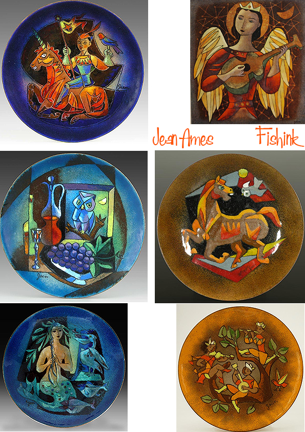 The Ames’s fascination with enameling began in 1941 when they saw an exhibition of the work of Karl Drerup at Scripps College where Jean Ames taught. Largely self-taught – through trial and error and by reading the few technical books available at the time — they began enameling in earnest in 1948 after attending a brief workshop offered at Scripps by the ceramist Rick Petterson.