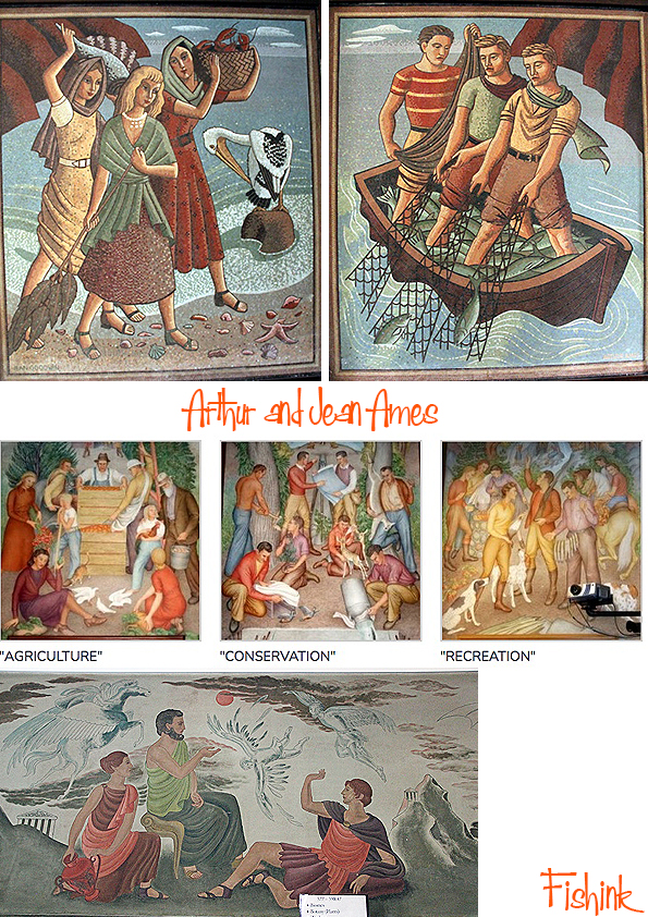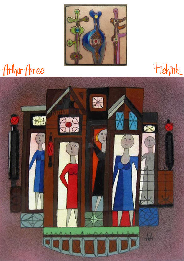 Arthur Ames’s enamels were featured in several important early exhibitions including the watershed Enamel: A Historic Survey to the Present Day, held in 1954 at the Cooper Union Museum for the Arts of Decoration, the precursor to the Cooper-Hewitt National Design Museum, and Objects USA, which toured this country and Europe after its initial presentation at the Smithsonian Institution’s National Collection of Fine Arts in 1969. Below is work by Arthur Ames, “Three Fisherman,” Federal Art Project mosaic for Newport Harbor Union High School, 1937.