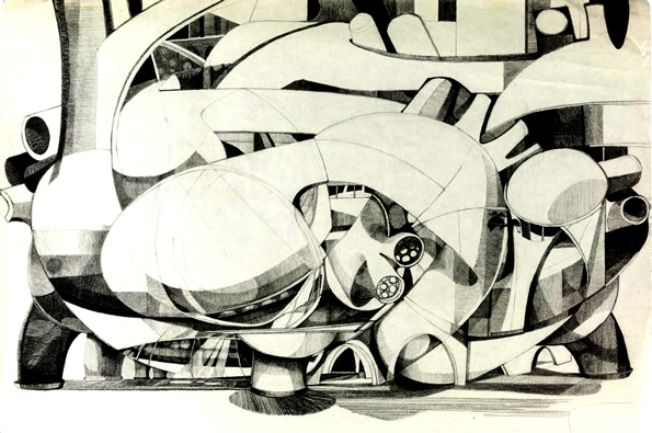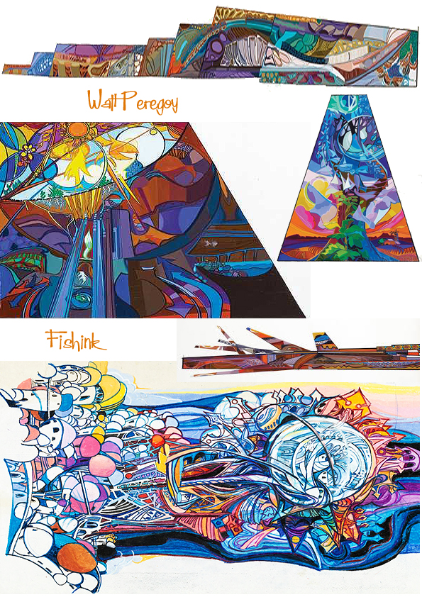 He returned to Disney (WED Enterprises in 1977 through 1983), contributing his unique view to the design of Epcot Center in Florida, where his influence included architectural facades, sculptures, fountains, show rides, murals and pavilions. This study drawing was done for his design work at the Epcot Center, in the Land and Imagination Building.