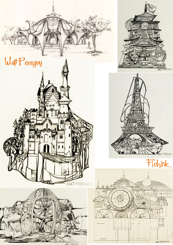 He returned to Disney (WED Enterprises in 1977 through 1983), contributing his unique view to the design of Epcot Center in Florida, where his influence included architectural facades, sculptures, fountains, show rides, murals and pavilions. This study drawing was done for his design work at the Epcot Center, in the Land and Imagination Building.