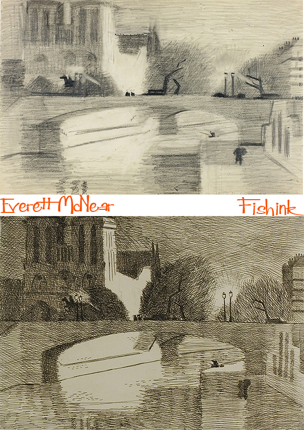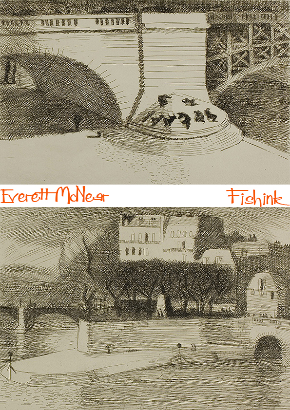 In 1932, McNear made his first of many trips to Europe. Hungry for personal and artistic growth, he scheduled an exhaustive program that would guide him through much of Western Europe, including time spent at the Academie Moderne studying etching with Marcoussis. His travels are particularly important to an understanding of the artist and his work. In his book Young Eye Seeing, his collected letters document this first trip, express his motivations, and chart his goals. French engravings made around Notre Dame and along the Seine.