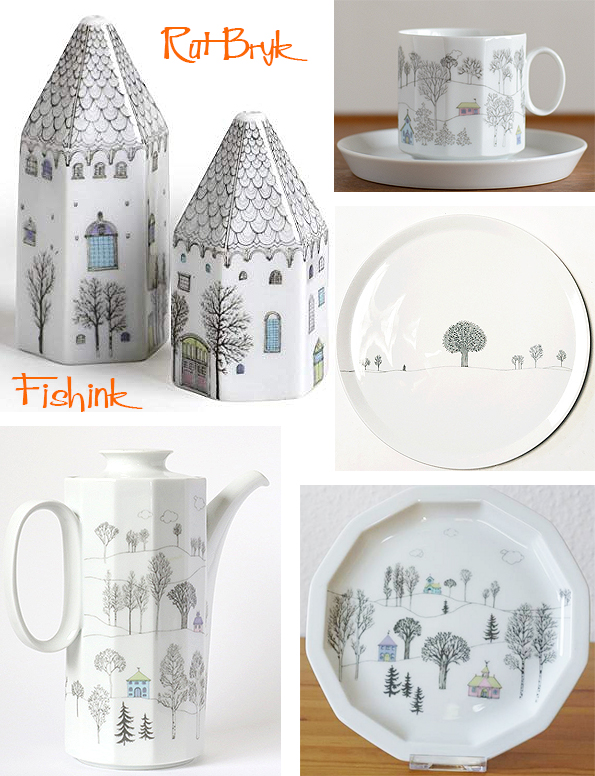 Another well-known set of ceramics by Rut is the tableware she designed in collaboration with her husband Tapio Wirkkala for the German porcelain manufacturer Rosenthal. Their tableware design radiates a tranquility that transcends the fact it is intended for repeated daily use. Again we see themes of trees and houses arise but in a flatter more illustrative form.